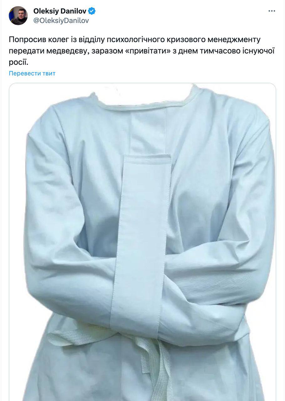 Секретарь СНБО Украины Алексей Данилов ответил Дмитрию Медведеву, который сегодня опять заявил о претензиях РФ на Киев, опубликовав фото смирительной рубашки.