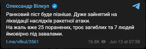 "Утренний пост будет позже. Очень занят на ликвидации последствий ракетной атаки. К сожалению, уже 25 раненых, трое погибших и 7 человек вероятно под завалами", - написал Вилкул.