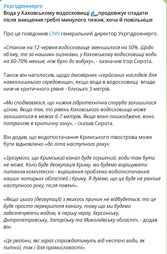 "Что касается объема, то, по нашим оценкам, в Каховском водохранилище воды на 60-70% меньше, чем было до взрыва", - отметил Сирота.