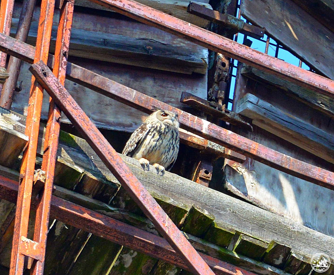 Возле нее сотрудник заповедника заметил самку и самца птицы. У подножия градирни лежали остатки птенца. Вероятно, филины соорудили гнездо слишком высоко на строительных лесах градирни - и малыш разбился.