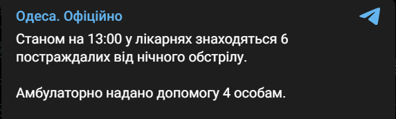 В больницах Одессы по состоянию на 13.00 находятся шесть пострадавших от ночного ракетного обстрела.