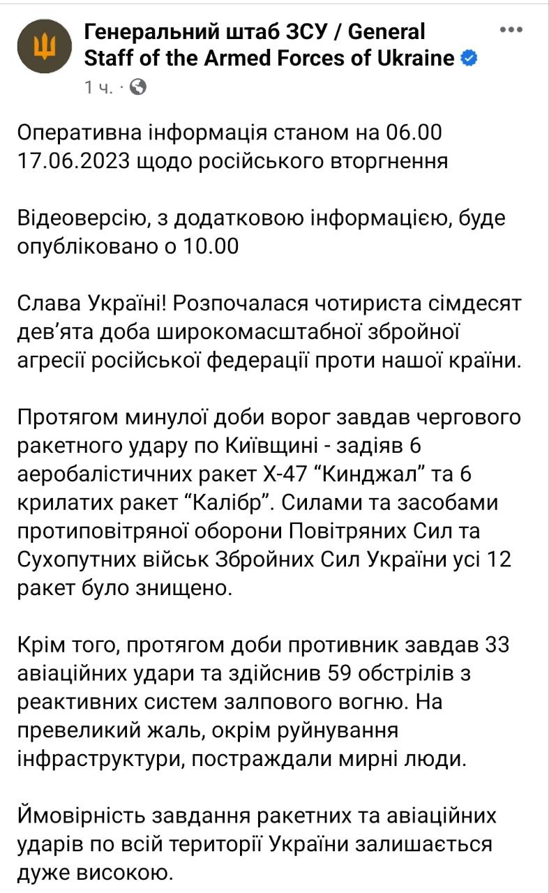 В субботу, 17 июня, Генштаб Вооруженных сил Украины опубликовал свежую утреннюю сводку с фронта.