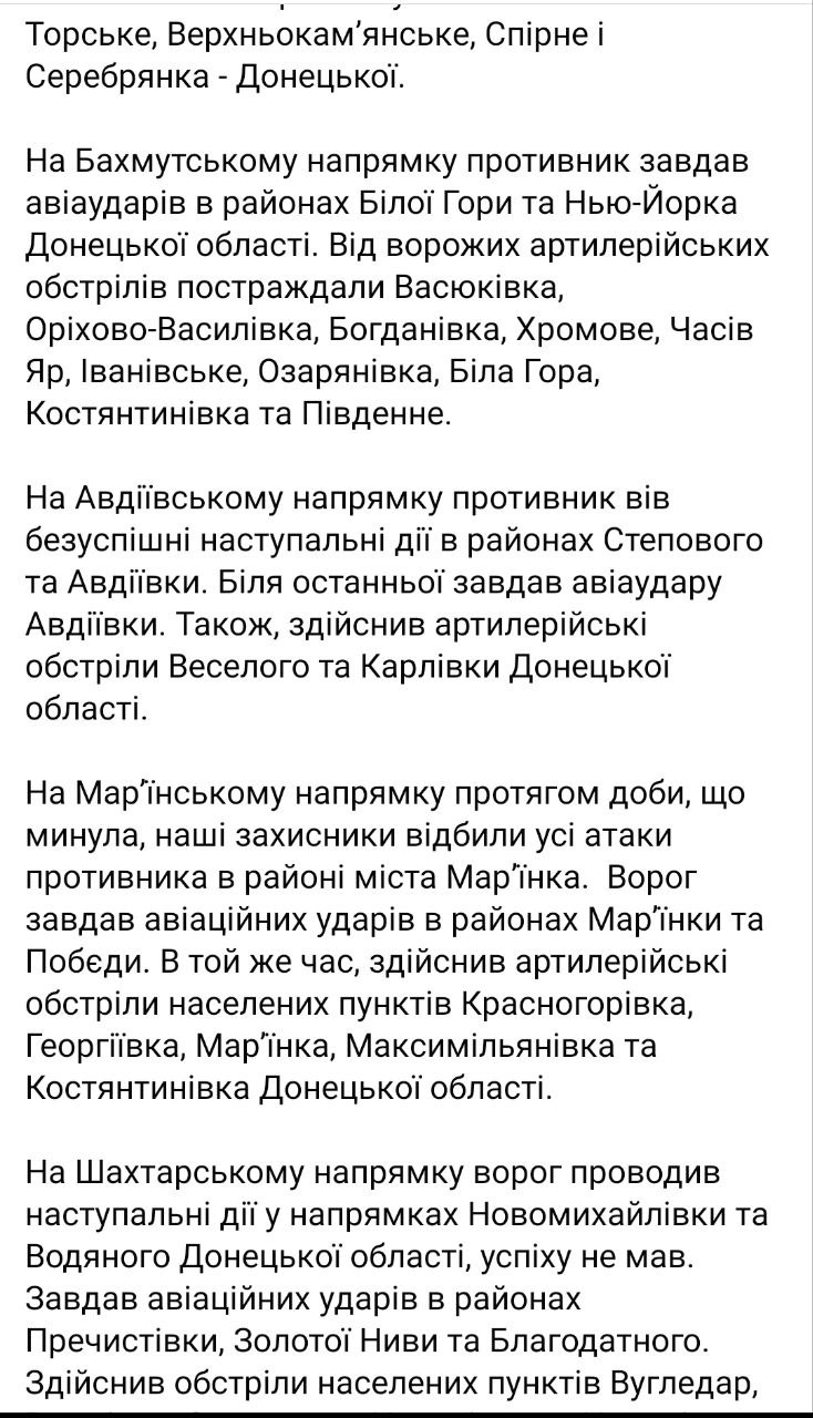 На Бахмутском направлении противник нанес авиаудары в районах Белой Горы и Нью-Йорка Донецкой области. От вражеских артиллерийских обстрелов пострадали Васюковка, Орехово-Василевка, Богдановка, Хромово, Часов Яр, Ивановское, Озаряновка, Белая Гора, Константиновка и Южное.