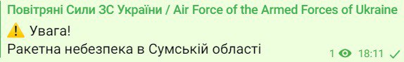 18:14 Воздушные силы сообщают о ракетной опасности в Сумской области.