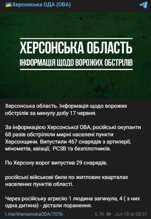 За сутки россияне обстреляли Херсонскую области 68 раз, есть погибший