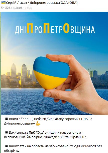 07.30 Ночью на Днепропетровскую область была атака бспилонкиов. Силы ПВО сбили все четыре выпущенных РФ дрона.