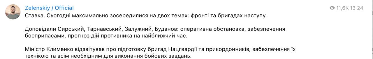 По оперативной обстановке, обеспечению боеприпасами и прогнозу действий противника на ближайшее время докладывали командующий сухопутными войсками Александр Сырский, командующий оперативно-стратегической группировкой войск "Таврия" Алеександр Тарнавский, главнокомандующий ВСУ Валерий Залужный и глава ГУР Кирилл Буданов.