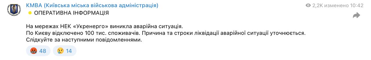 "На сетях Укрэнерго возникла аварийная ситуация. По Киеву отключены 100 тыс. потребителей. Причина и сроки ликвидации аварийной ситуации уточняется", - говорится в сообщении.