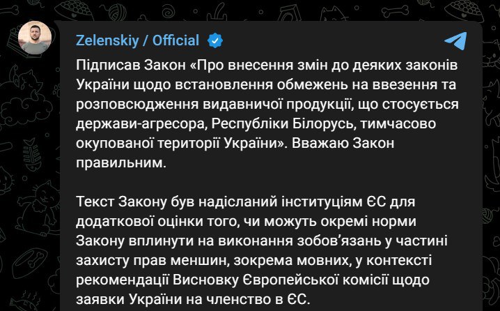 Зеленский подписал закон о запрете российской издательской продукции в Украине