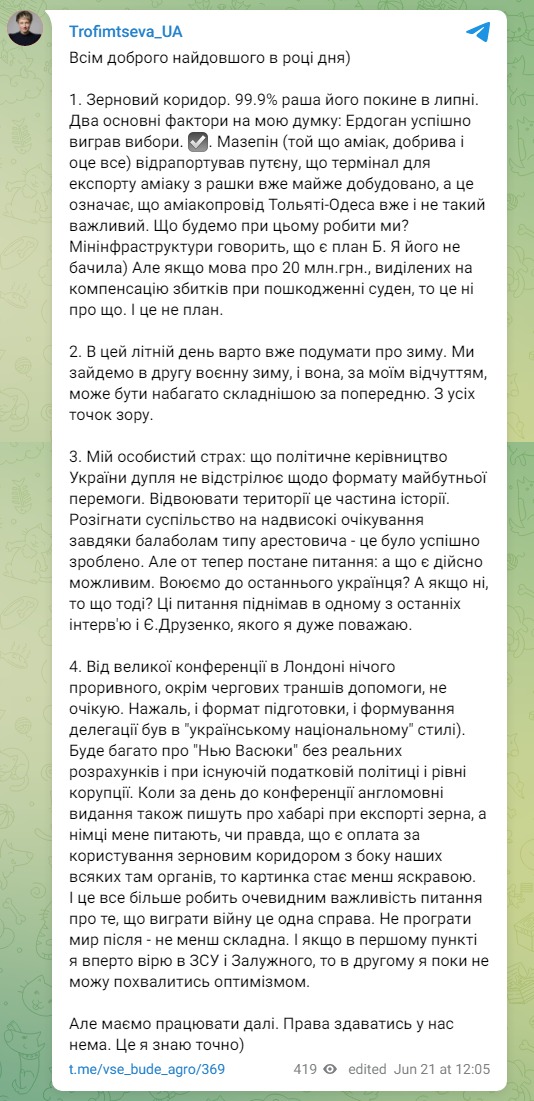 "Зерновой коридор. 99,9%, что Россия выйдет из него в июле", - отметила Трофимцева.
