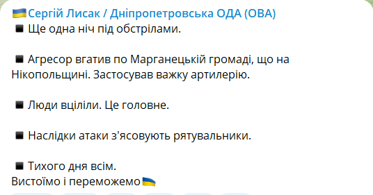 Также сегодня ночью войска РФ ударили из тяжелой артиллерии по Марганецкой общине Никопольщины, люди не пострадали.