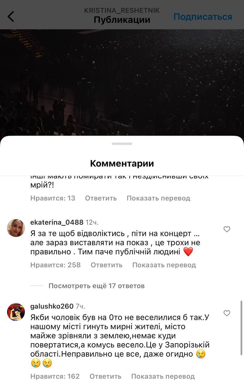 "Если бы муж был на "нуле", не веселился бы так. В нашем городе гибнут мирные жители, город почти сравняли с землей, некуда возвращаться, а кому-то весело. Это в Запорожской области. Неправильно это все, отвратительно"; "А почему Гриша за границей? На него берцев не хватило или броника?"; "Почему мужчины, как рабы, одни на фронте, другие не свободны в передвижении, а ваш бык на концерт заграницу… Какие вы отвратительные", - пишут люди.