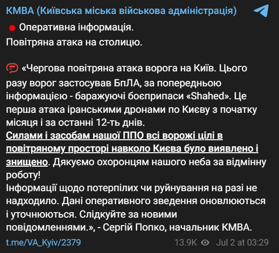 "Очередная воздушная атака противника на Киев. На этот раз враг применил БПЛА, по предварительной информации – барражирующие боеприпасы "Shahed". Это первая атака иранскими дронами по Киеву с начала месяца и за последние 12 дней", - сообщил руководитель городской военной администрации Сергей Попко.