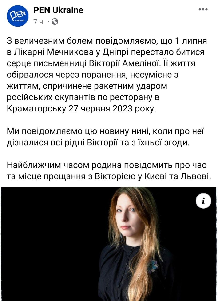 После удара РФ по пиццерии Краматорска погибла украинская писательница Виктория Амелина. Таким образом она стала 13-й жертвой ракетной атаки.