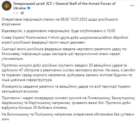 Утром 10 июля Генштаб ВСУ обнародовал сводку о ситуации на фронте.