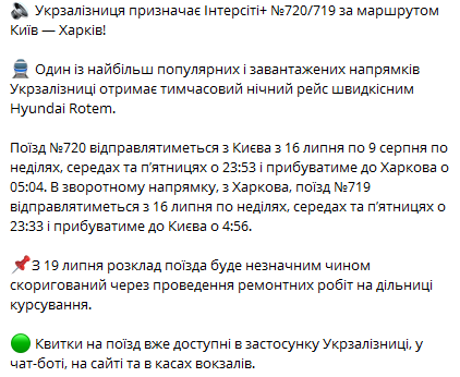 • из Киева поезд №720 будет отправляться с 16 июля по 9 августа по воскресеньям, средам и пятницам в 23:53 и прибывать в Харьков в 05:04;