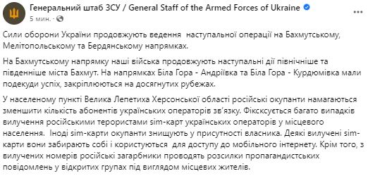 В населенном пункте Большая Лепетиха Херсонской области российские оккупанты пытаются уменьшить количество абонентов украинских операторов связи. Фиксируется множество случаев изъятия российскими террористами sim-карт украинских операторов у местного населения. Иногда sim-карты оккупанты уничтожают в присутствии владельца. Некоторые извлеченные sim-карты они забирают себе и пользуются для доступа к мобильному интернету. Кроме того, из изъятых номеров российские захватчики производят рассылки пропагандистских сообщений в открытых группах под видом местных жителей.
