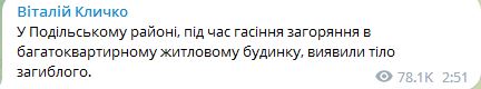 В Подольском районе, по данным мэра Кличко, во время тушения пожара в многоквартирном доме, нашли тело погибшего.