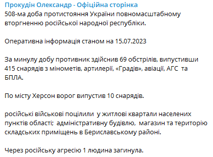 В Херсонской области за минувшие сутки противник совершил 69 обстрелов, выпустив 415 снарядов из минометов, артиллерии, "Градов", авиации, АГС и БПЛА. По городу Херсон враг выпустил 10 снарядов.