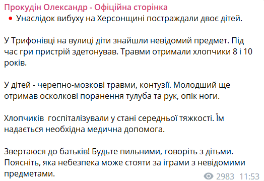 В Херсонской области неизвестный предмет сдетонировал в руках детей. Травмы получили мальчики 8 и 10 лет.