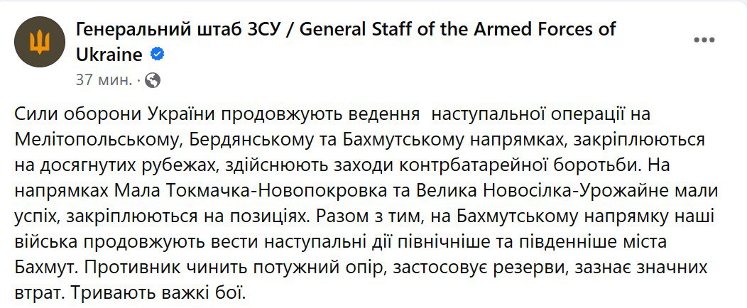 Украинские военные за сутки продвинулись на Запорожском фронте. Силы обороны Украины продолжают вести наступательную операцию на Мелитопольском, Бердянском и Бахмутском направлениях.