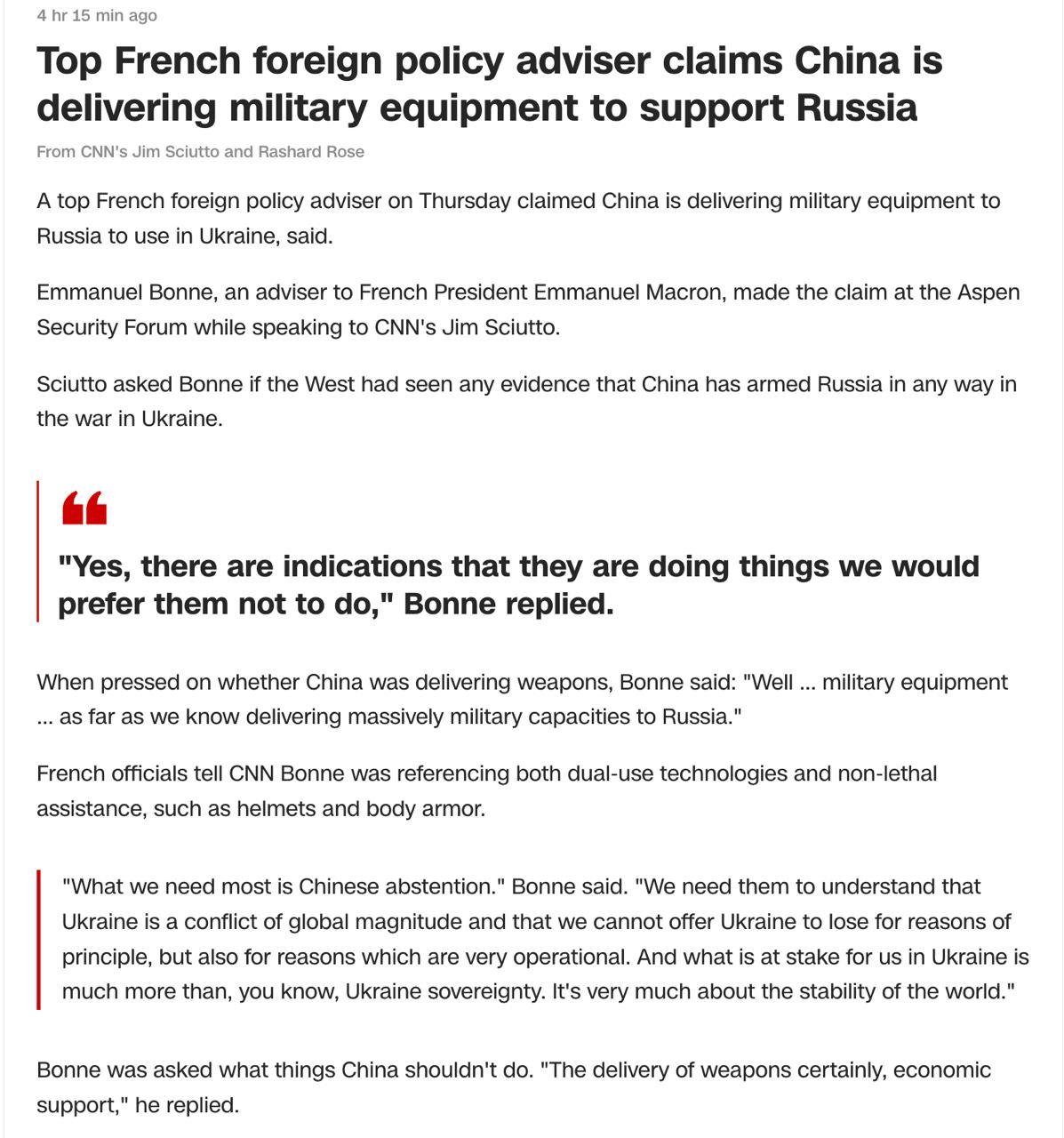 На вопрос о том, поставляет ли Китай непосредственно оружие, Бонн ответил несколько расплывчато: "Ну... военное оборудование... как нам известно, он поставляет значительные военные мощности в Россию".