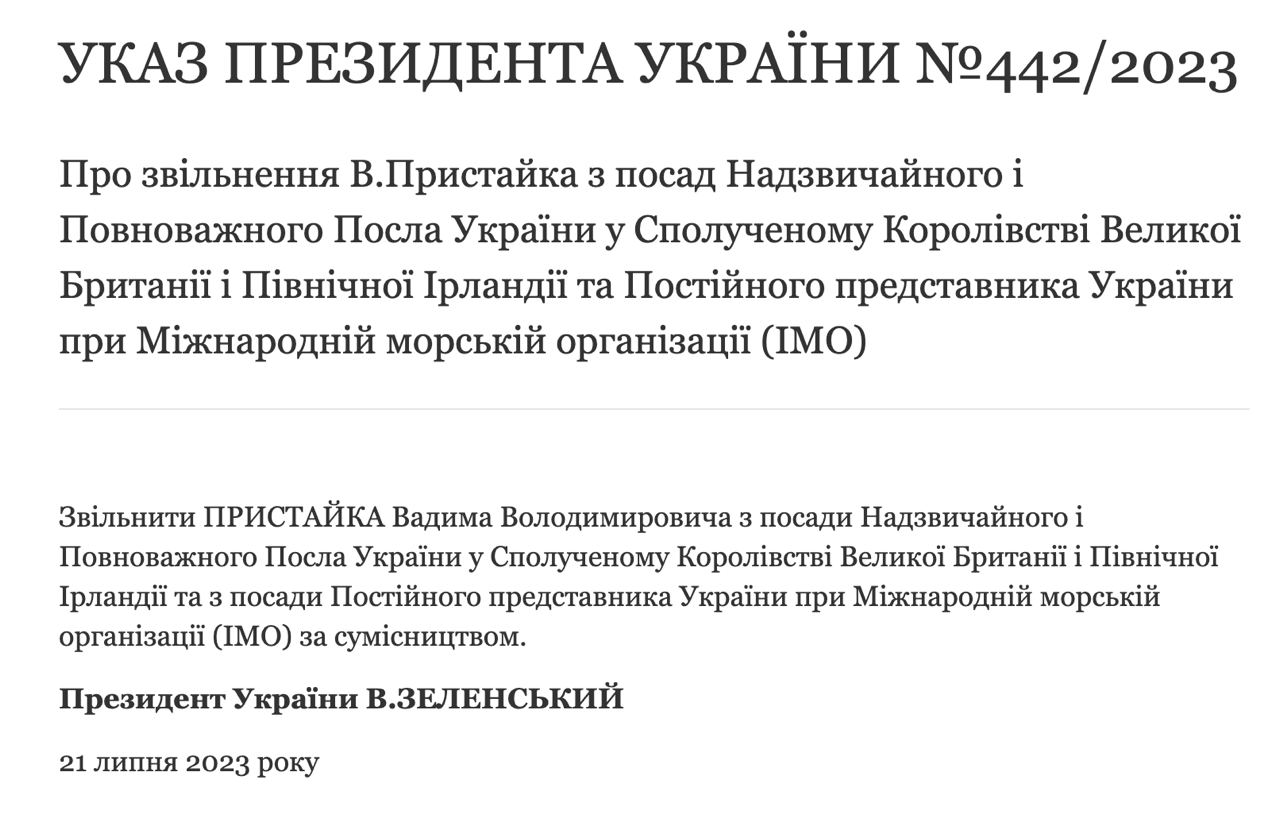 "Уволить Пристайко Вадима Владимировича с должности чрезвычайного и полномочного посла Украины в Соединенном Королевстве Великобритании и Северной Ирландии и с должности постоянного представителя Украины при Международной морской организации (IMO) по совместительству", - сказано в тексте документа.