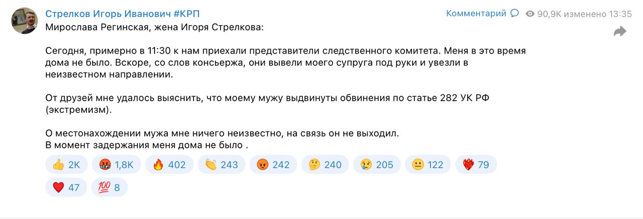 Как она написала, ее не было дома в момент задержания мужа, но консьерж рассказал, что примерно в 11:30 приехали представители Следственного комитета РФ, а вскоре вывели Стрелкова под руки и увезли в неизвестном направлении.