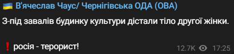 "Из-под завалов дома культуры достали тело второй женщины", - написал Чаус.