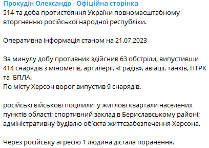 Российские военные попали в жилые кварталы населенных пунктов области; спортивное заведение в Бериславском районе; административное здание объекта жизнеобеспечения Херсона, один человек получил ранения, сообщил Прокудин.