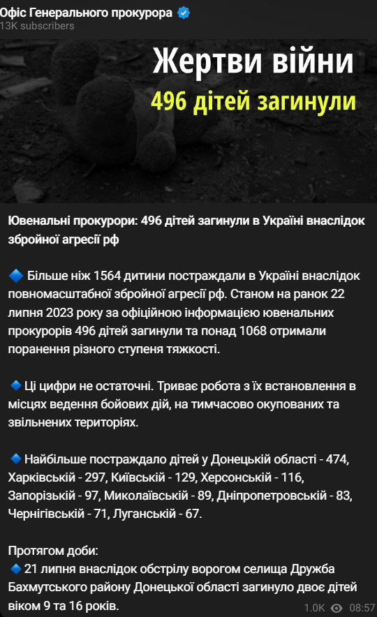 В Украине в результате вооруженной агрессии РФ погибли свыше 496 детей - Офис генпрокурора