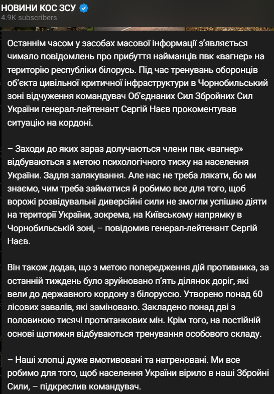 "Мероприятия, к которым сейчас присоединяются члены ЧВК "Вагнер", проходят с целью психологического давления на население Украины. Для устрашения. Но нас не нужно пугать, потому что мы знаем, чем нужно заниматься и делаем все для того, чтобы вражеские разведывательные диверсионные силы не смогли успешно действовать на территории Украины, в частности, на Киевском направлении в Чернобыльской зоне", – сообщил генерал-лейтенант Сергей Наев.