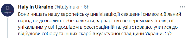"Свободный народ не запугать, варварство не восторжествует. Италия с её уникальными в мировом масштабе компетенциями по реставрации готова взять на себя реконструкцию собора и других украинских сокровищ культуры", - заявила премьер-министр Италии Джорджа Мелони.