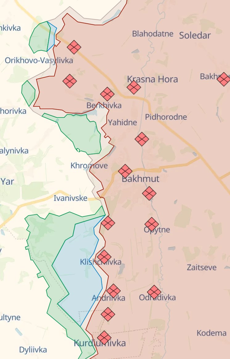 Судя по карте украинских военных телеграм-каналов, южнее Бахмута глубоко вклиниться в оборону противника для обходного маневра пока не получилось, а севернее российские позиции образуют уходящий на запад выступ в районе Орехово-Василевки (Череватый подтвердил, что там продвижение идет труднее, чем на южном фланге).