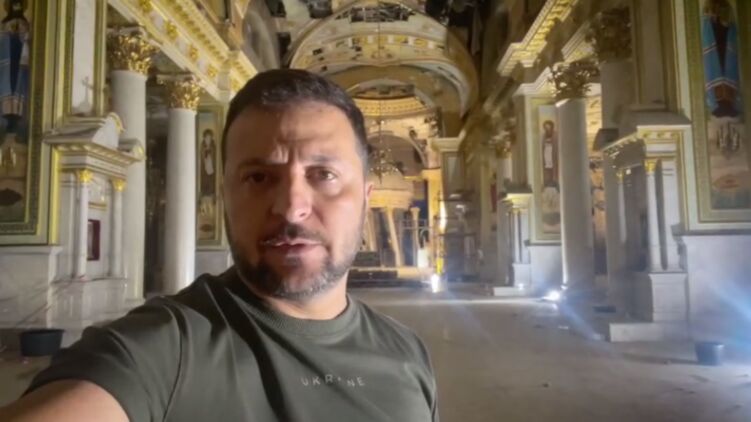 Президент Украины Владимир Зеленский опубликовал вечернее видеообращение в четверг, 27 июля, из пострадавшего после обстрела Спасо-Преображенского собора в Одессе.