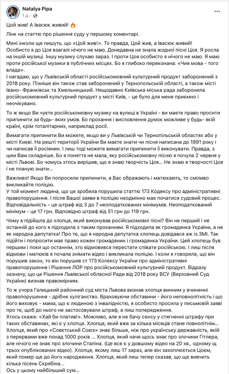 Уличного музыканта, который пел песни Цоя во Львове, суд признал виновным в мелком хулиганстве
