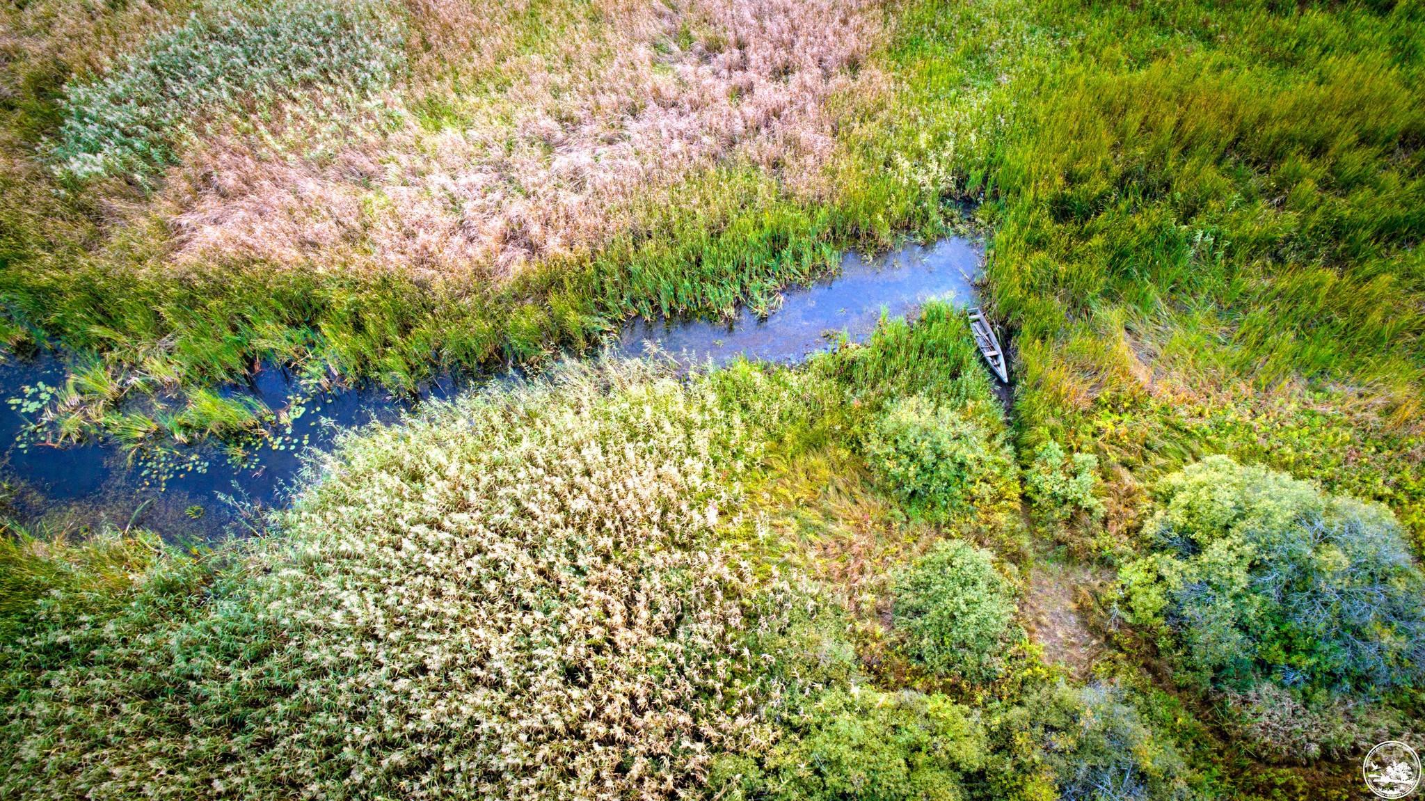 На второй фотографии в кадр попали заповедные просторы с многочисленными водными артериями, понемногу зарастающими болотной зеленью,  среди которой затерялась одинокая лодка.
