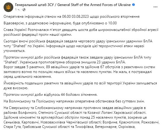 Утром 3 августа Генштаб ВСУ обнародовал сводку о ситуации на фронте.