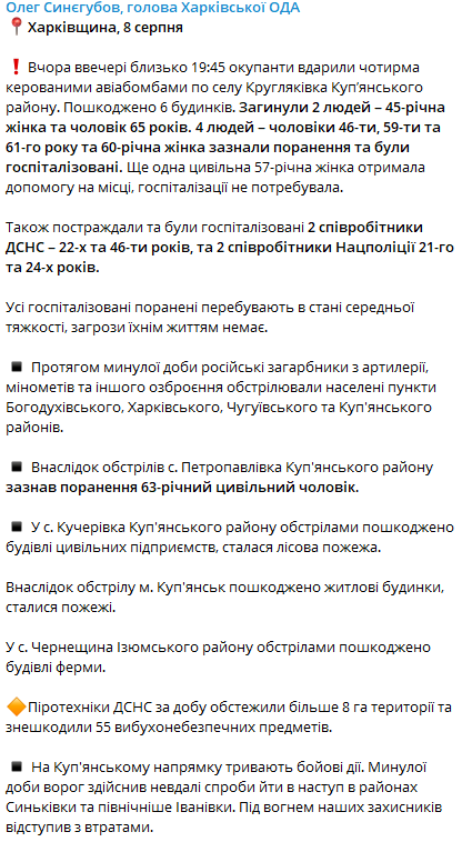 В Кругляковке Купянского района Харьковской области по состоянию на утро вторника 8 августа известно о двух погибших и девяти пострадавших в результате вчерашних обстрелов.