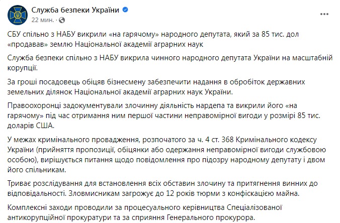 СБУ совместно с НАБУ разоблачили народного депутата, который за 85 тысяч долларов продавал землю Национальной академии аграрных наук. За деньги парламентарий обещал бизнесмену обеспечить предоставление участков академии под возделывание.