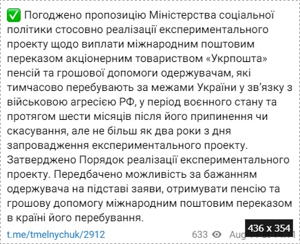 Кабинет министров одобрил экспериментальный проект с выплатами "Укрпочтой" пенсий и денежной помощи получателям, временно находящимся за пределами Украины в связи с военной агрессией РФ.