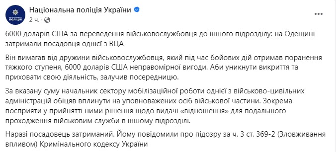 В Одесской области чиновник вымогал у жены тяжелораненого бойца деньги за перевод в другую часть
