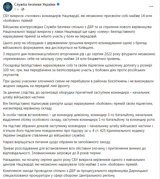 "Чиновники безосновательно начисляли себе и своим подчиненным ежемесячную доплату в размере 100 тысяч грн, предусмотренную за непосредственное участие в боевых действиях. При этом участники преступной схемы не находились в районах боестолкновений и не выполняли никаких задач на передней линии фронта. По данным следствия, к организации сделки причастен заместитель командира – начальник штаба воинской части. Он безосновательно подписывал рапорты о начислении "боевых" премий своим подчиненным, прежде всего руководящему составу. Их лица также установлены: командир дивизиона, командир 3-го батальона, начальник отделения учета личного состава, заместитель командира 1-го батальона и командир роты", - сказано в посте.