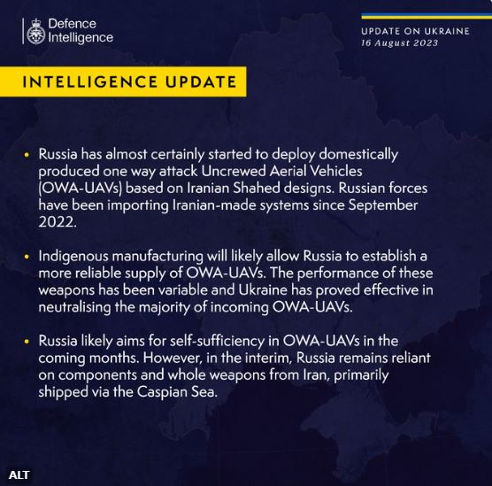 В британской разведке отмечают, что Россия, вероятно, стремится к самообеспечению беспилотниками в ближайшее время. При этом она по-прежнему зависит от комплектующих из Ирана, которые в основном доставляются через Каспийское море.