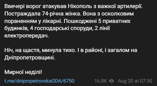 В субботу вечером, 19 августа, россияне атаковали Никополь Днепропетровской области из тяжелой артиллерии. В результате обстрела есть пострадавшая женщина.