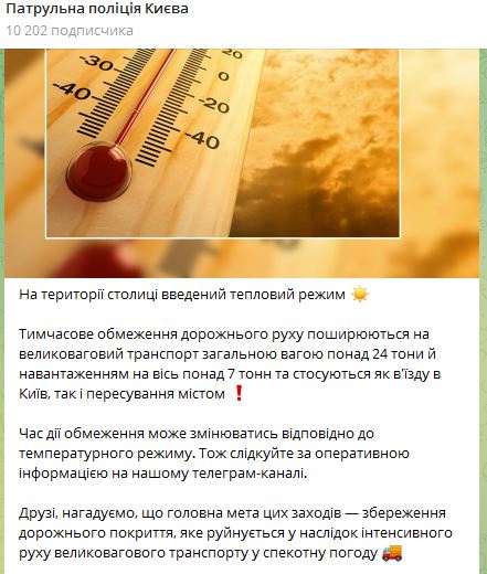 На территории Киева введен тепловой режим. Временно ограничено движение тяжеловесного транспорта.
