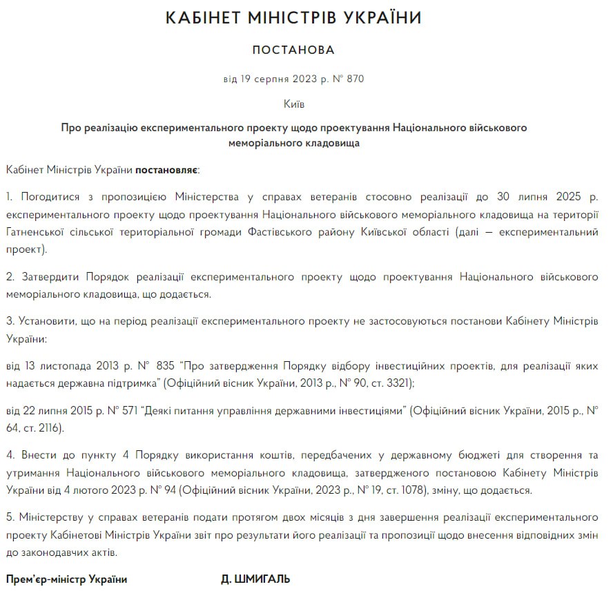 Согласно документу, кладбище должно быть создано до 30 августа 2025 года в поселке Гатное Фастовского района Киевской области, который граничит с Киевом.