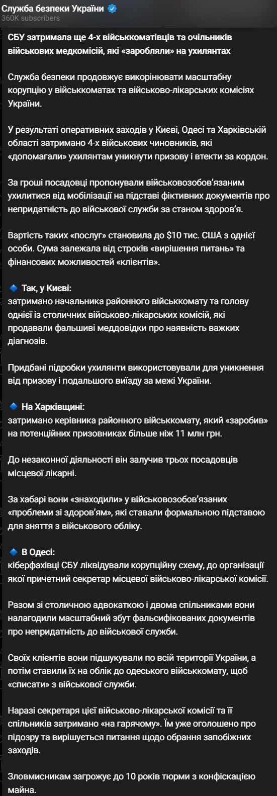 Служба безопасности Украины задержала еще 4-х военкомов и руководителей военных медкомиссий, которые зарабатывали на уклонистах. Руководителей ТЦК задержали в Киеве, Одессе и Харьковской области.