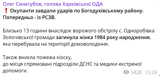 "Около 13 часов в результате вражеского обстрела села Одноробовка Золочевской общины погибла женщина 1984 года рождения, которая находилась на территории домовладения", - написал Синегубов.
