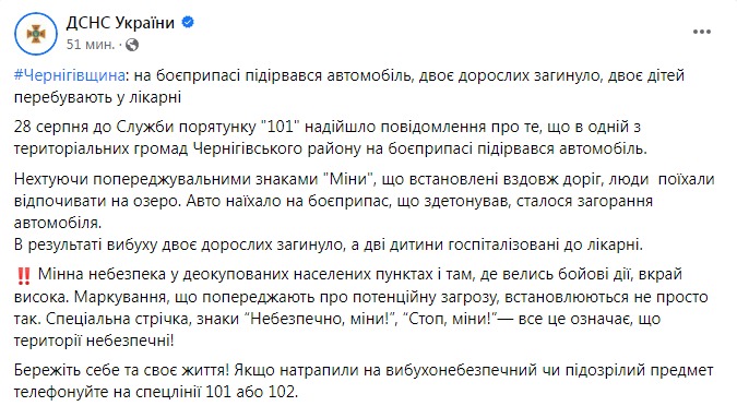28 августа в службу спасения "101" поступила информация о том, что в одной из территориальных общин Черниговского района на боеприпасе взорвался автомобиль. Пренебрегая предупредительными знаками "Мины", установленными вдоль дорог, люди поехали отдыхать на озеро. Их авто наехало на сдетонировавший боеприпас, произошло возгорание автомобиля.